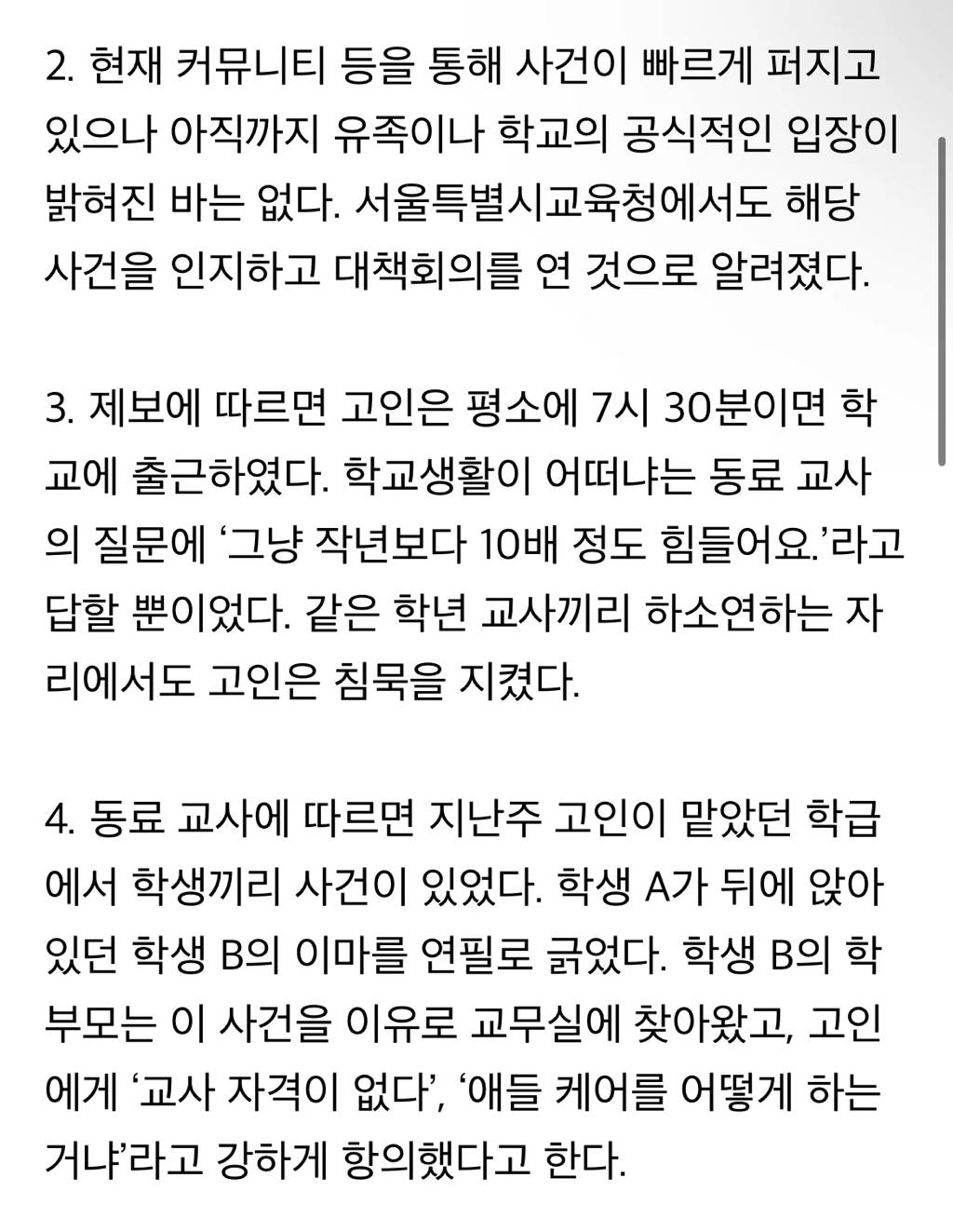 현재 들리는 내용에 의하면, 학부모의 지속적인 갑질로 인해 교사가 이를 참지 못하고 극단적인 선택을 한 것으로 추정되며, 블라인드에는 학교와 학교장, 교육청이 사건을 교사의 개인사로 인한 사건으로 치부하며 고의적으로 덮으려고 한다는 글까지 올라와 각종 커뮤니티에서 화제가 되고 있다고 합니다.