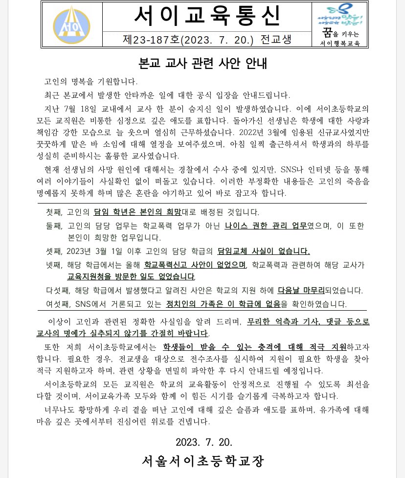 2023년 7월 18일, 서울서이초등학교에 구급차, 과학수사대 등이 출동하였다는 목격담이 만연하였고, 이튿날인 19일에 신규 교사가 교내에서 극단적 선택을 한 사실이 기사화되었다.